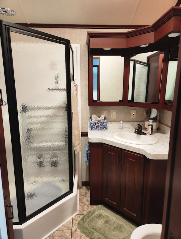 The washroom has a stand-up shower and has storage around the sink as well as a large cupboard for linens and paper products.