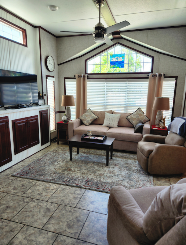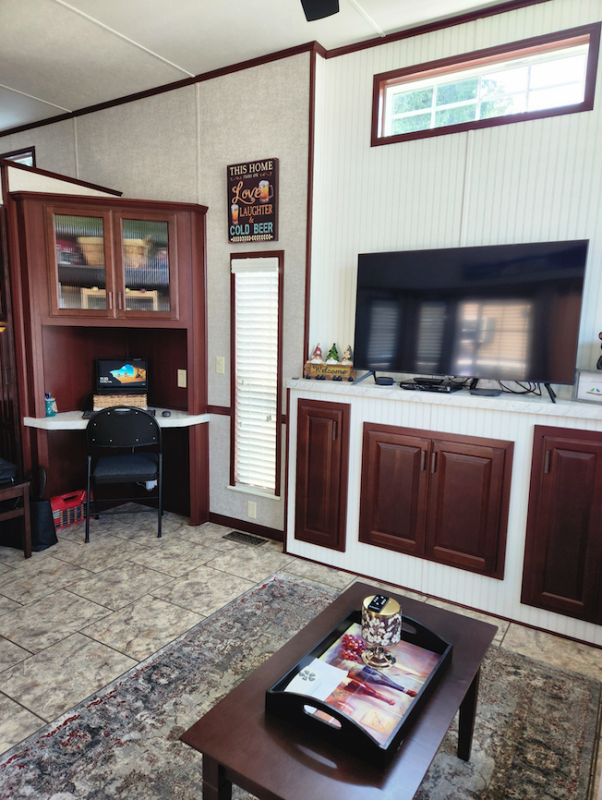 The Florida room is accessible from the kitchen in the trailer as well as from both the front and back decks. The room is 10ft x 16ft and is very private as new blinds were installed in 2024.
