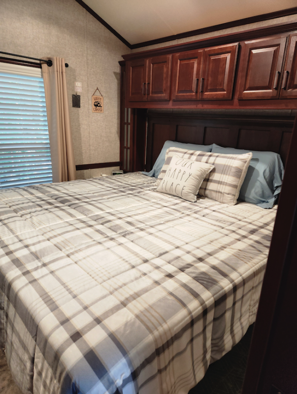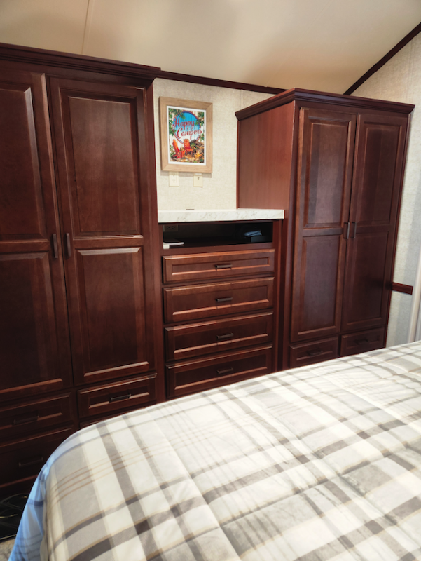 The trailer has one bedroom with a king bed, underbed storage, lots of storage with closets, drawers and above bed cupboards. There is a powerful overhead fan, a spot to hook up a TV and lots of lighting.